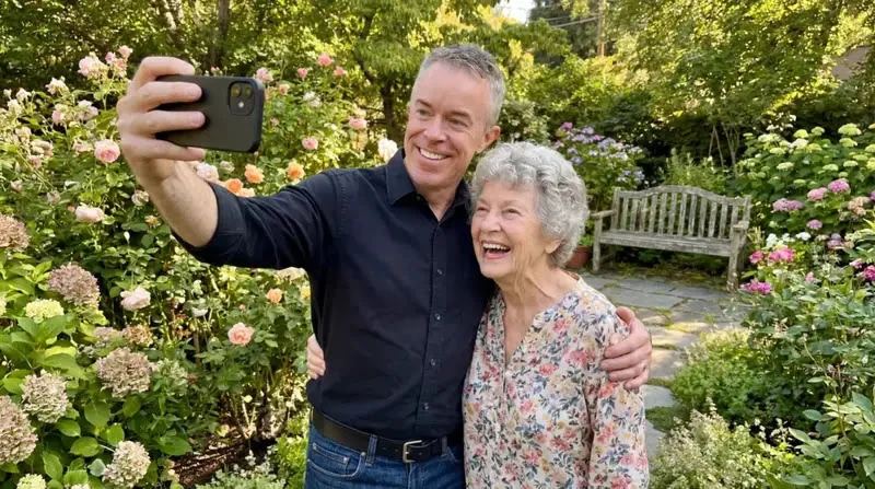 Jacob and his mother during a visit at her home — a moment captured in her garden